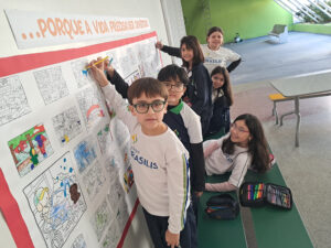 A pintura também faz parte das experiências e convivências que tornam o dia a dia escolar ainda mais especial. E foi assim, entre cores, risadas e muita criatividade, que os alunos do 4º ano do Ensino Fundamental, da Unidade I, transformaram um simples painel colado na parede em uma verdadeira obra coletiva.